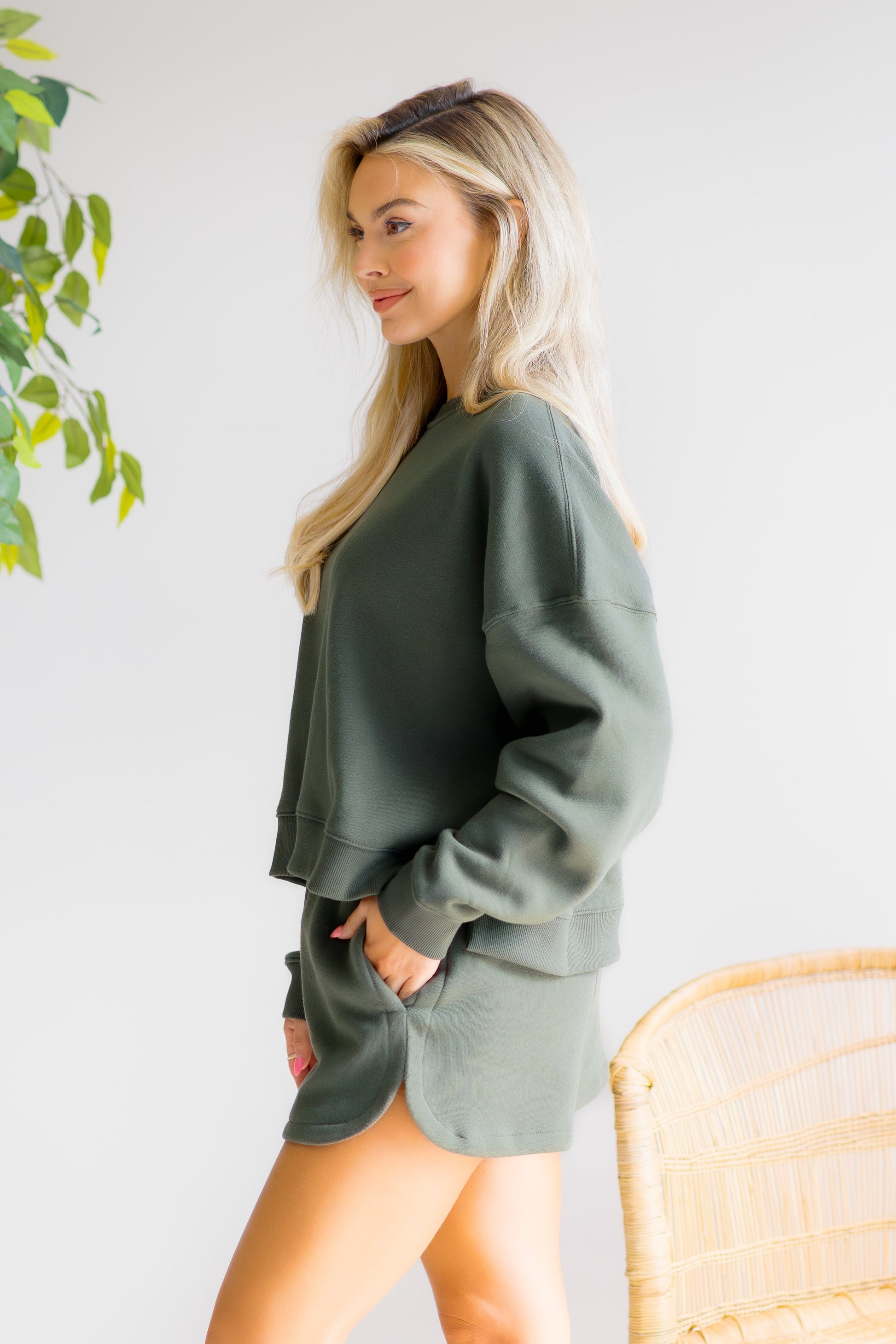 Experience cozy comfort with the Forest Whisper Set, featuring a soft fleece long sleeve sweatshirt paired with elastic waistband shorts. Designed for effortless wear, the shorts include convenient side pockets to keep essentials close. Perfect for relaxing at home or casual outings, this set combines warmth and practicality in a stylish way.