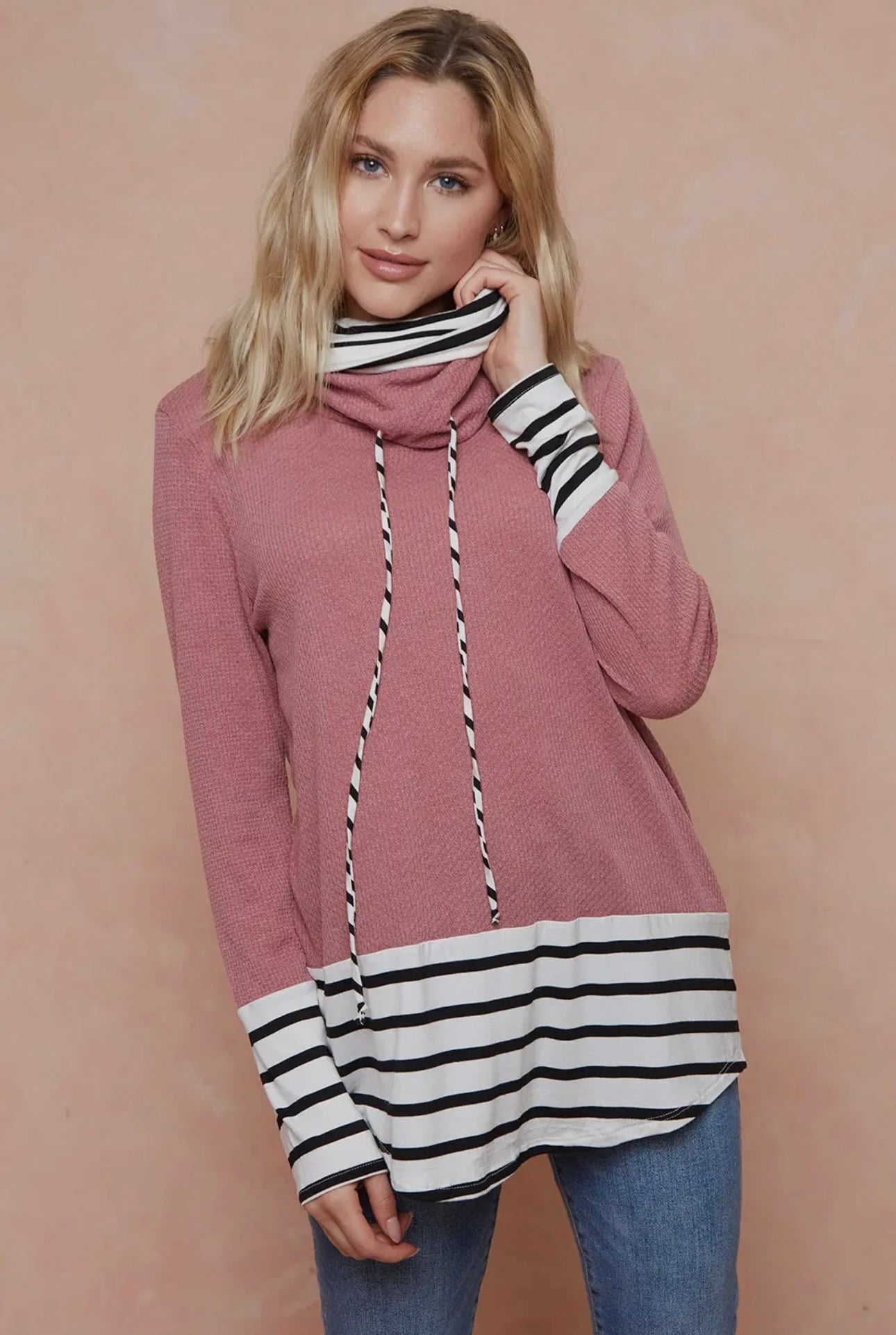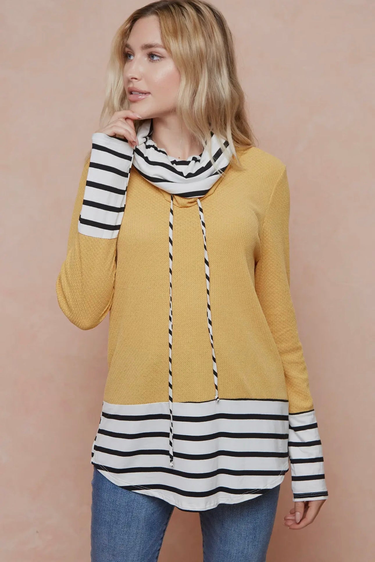 Two looks in one! This long sleeve top gives you that cute layered look without the bulk. Features a soft waffle knit body with striped contrast at the hem, cuffs, and neckline. The cowl neck with tie detail adds the perfect cozy touch.