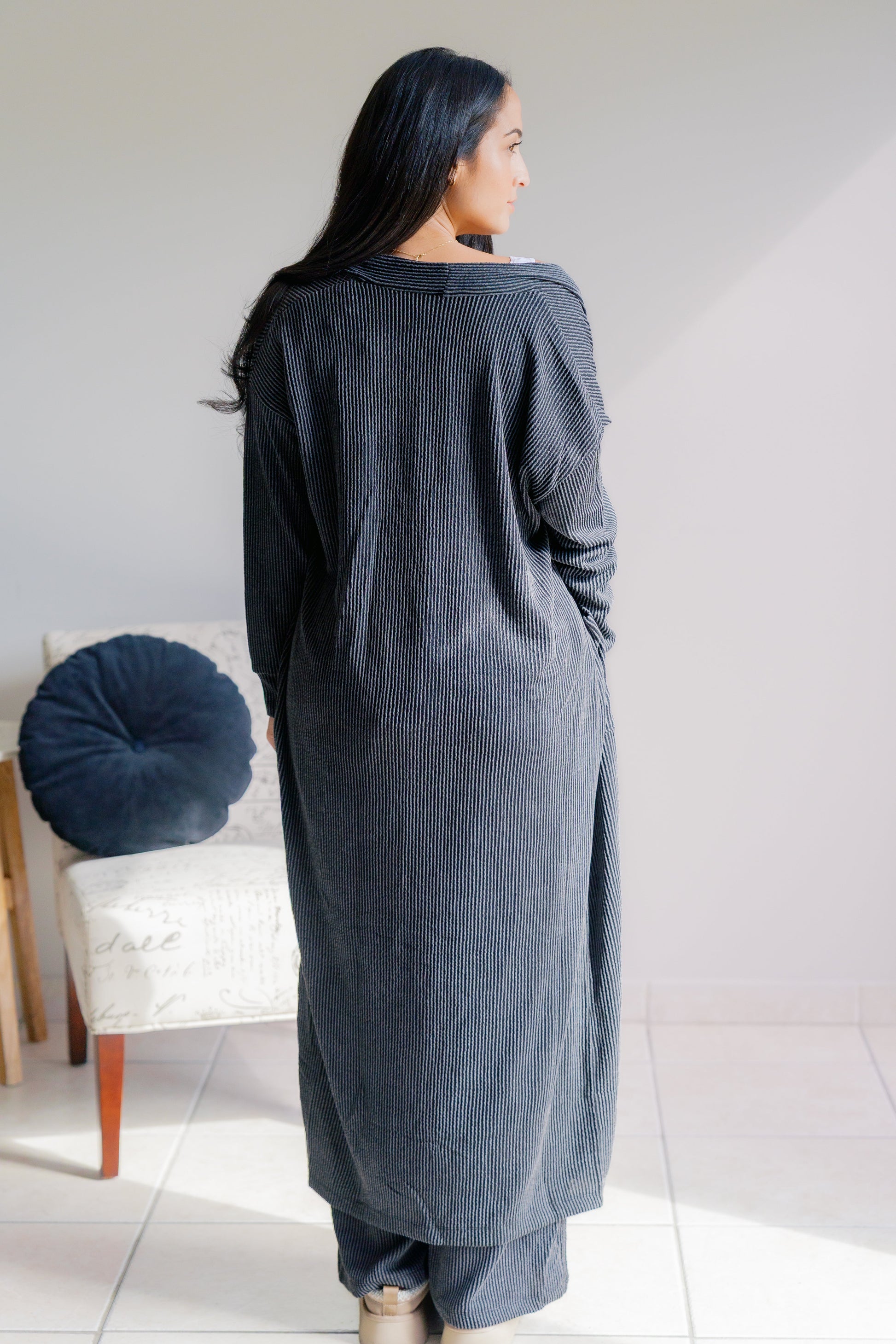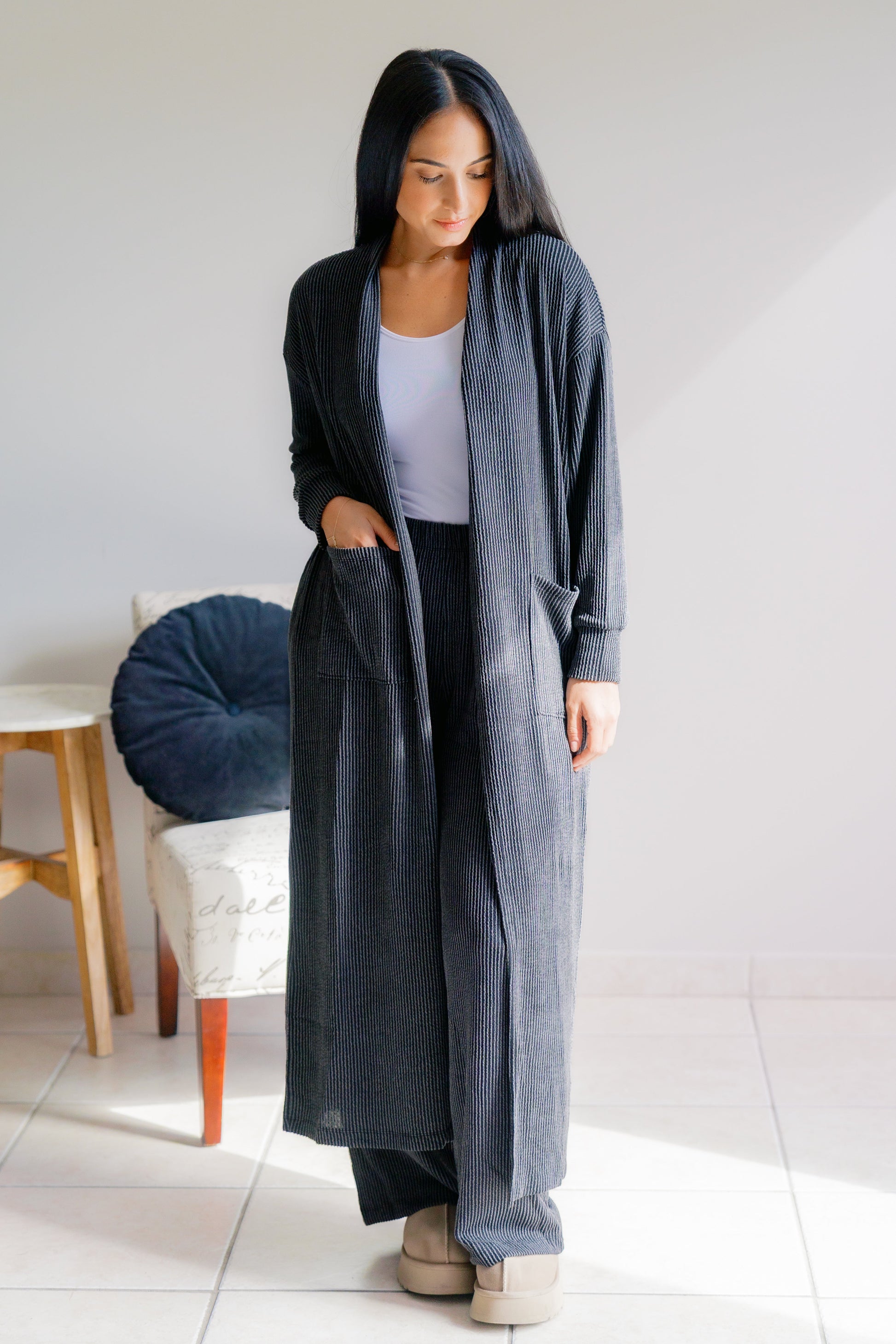 Step into effortless style with the Shadow Play Set, featuring a sleek black duster-length cardigan paired with flowing bottoms. This combo brings a playful twist to your wardrobe, blending comfort and movement with elegant flair. Perfect for days when you want to feel both relaxed and polished, it’s your go-to for layering that stands out.